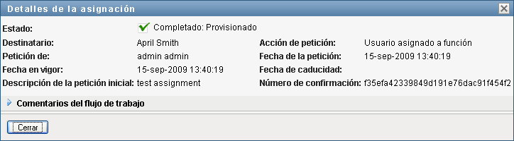 La acción permite ver el estado de las peticiones de asignación de función, incluidas las peticiones que ha realizado directamente, así como las peticiones de asignación de función para grupos o contenedores a los que pertenece. Permite ver el estado actual de cada petición. Además, ofrece la opción de retraer una petición no completada o finalizada si ha cambiado de opinión y no necesita que la petición se complete.