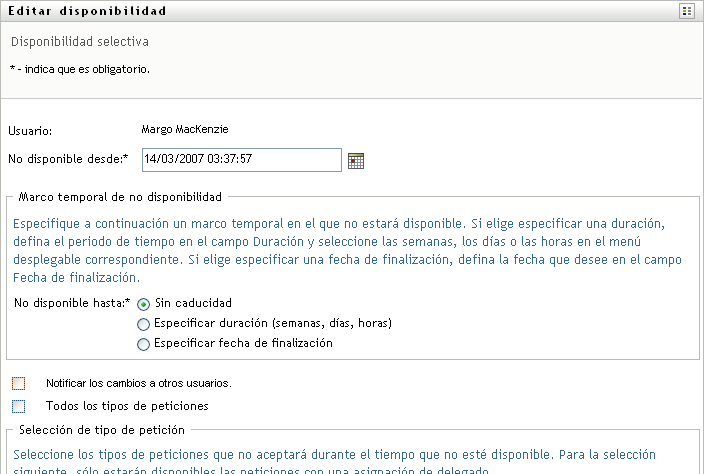 La aplicación de usuario muestra un conjunto de controles que permite especificar el período de tiempo durante el que no está disponible y seleccionar las peticiones a las que afectará este valor.