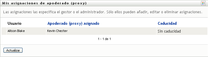 La acción permite ver y definir las asignaciones de apoderado (proxy). Si es administrador de provisión, supervisor de provisión o supervisor de equipo, también puede utilizar esta acción para editar asignaciones de apoderado.