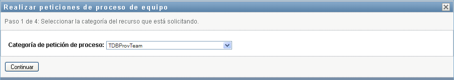 La página Realizar peticiones de proceso de equipo muestra una lista de los procesos que se pueden pedir. La lista sólo incluye los procesos para los que los supervisores de equipo tienen permitido iniciar peticiones.