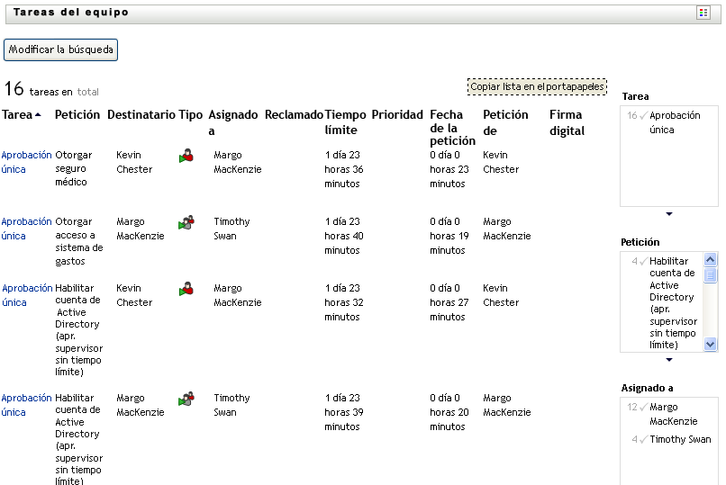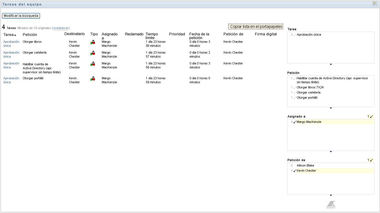 Por ejemplo, si hace clic en el nombre Margo en el filtro Asignar a, y en el nombre Kevin en el filtro Solicitado por, sólo verá las tareas asignadas a Margo Mackenzie solicitadas por Kevin Chester, tal y como se muestra en la Figura 12-4: