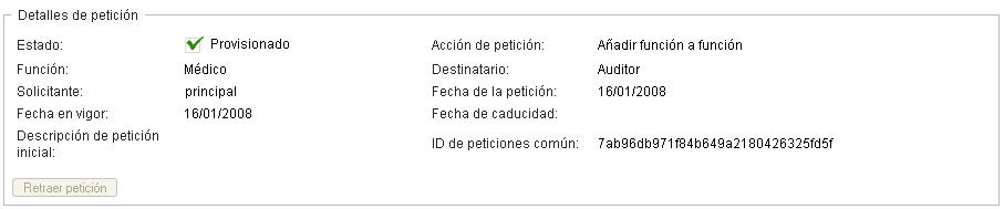 La acción permite ver el estado de las peticiones de funciones (incluidas las peticiones que ha realizado explícitamente, así como las peticiones de asignación de funciones para grupos o contenedores a los que pertenece). Permite ver el estado actual de cada petición. Además, ofrece la opción de retraer una petición no completada o finalizada si ha cambiado de opinión y no necesita que la petición se complete.