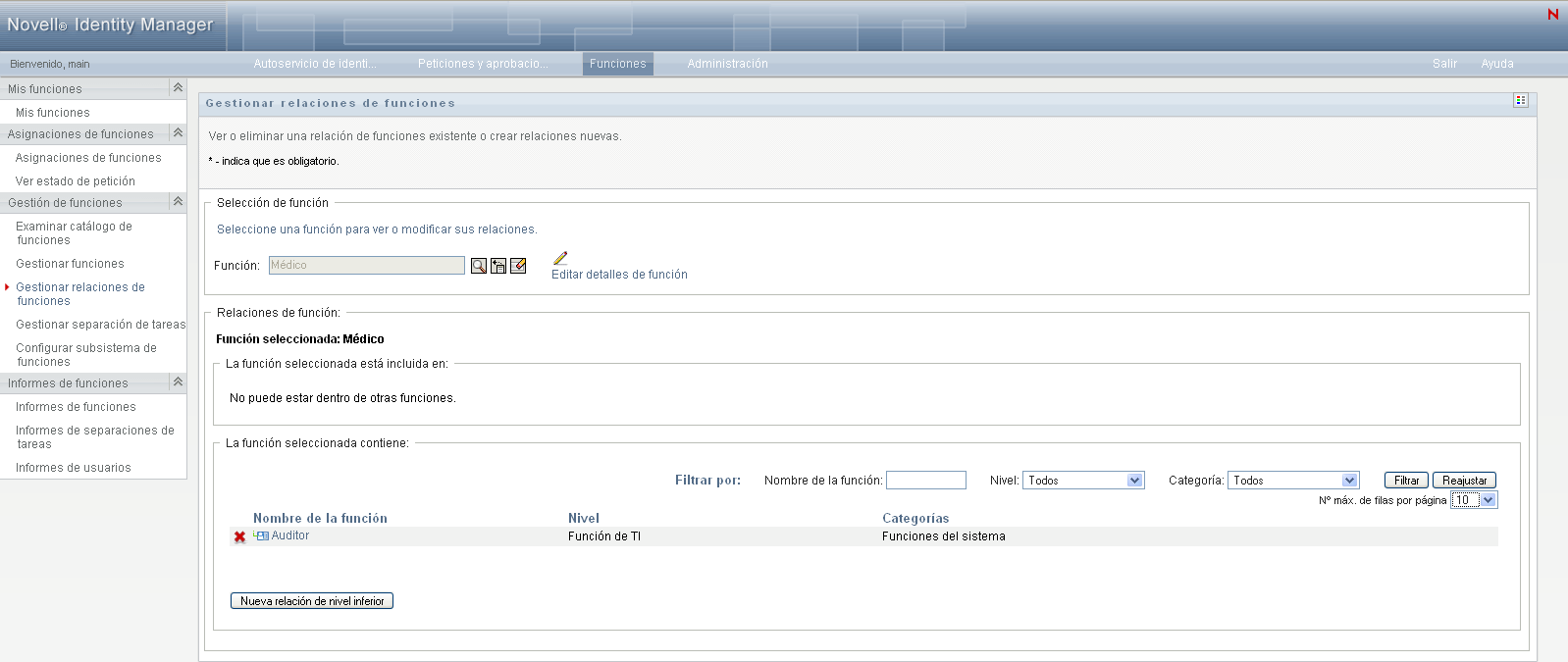 Las funciones de nivel inferior (funciones de permisos) pueden estar incluidas en funciones de nivel superior, pero no pueden contener otras funciones de nivel inferior. La página Relaciones de función sólo permite añadir nuevas relaciones de nivel superior.