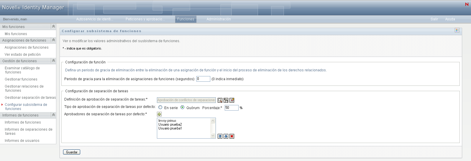 La acción de la pestaña de la interfaz de usuario del Gestor de identidades, permite especificar los ajustes administrativos del subsistema de funciones.