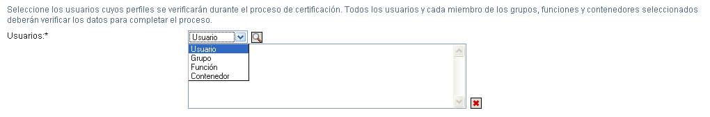 Debe seleccionar como mínimo un usuario, grupo, función o contenedor para iniciar un proceso de certificación. Sin embargo, no es necesario seleccionar ninguno de estos para guardar una petición.