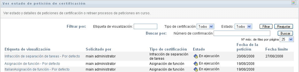 La acción muestra todas las peticiones de certificación, incluidas las que se están iniciando y procesando, las que se han completado y aquellas en las que se haya producido un error.