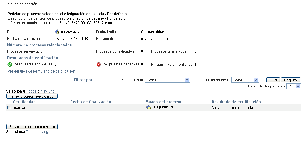 La acción le permite ver el estado de las peticiones de certificación. Además, tiene la opción de ver el estado detallado de cada proceso de flujo de trabajo iniciado por una petición y, opcionalmente, retirar uno o más procesos que se estén ejecutando.