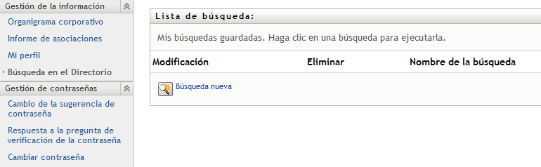 Puede utilizar la página Búsqueda en el Directorio para buscar usuarios, grupos o equipos introduciendo criterios de búsqueda o utilizando criterios de búsqueda guardados previamente.