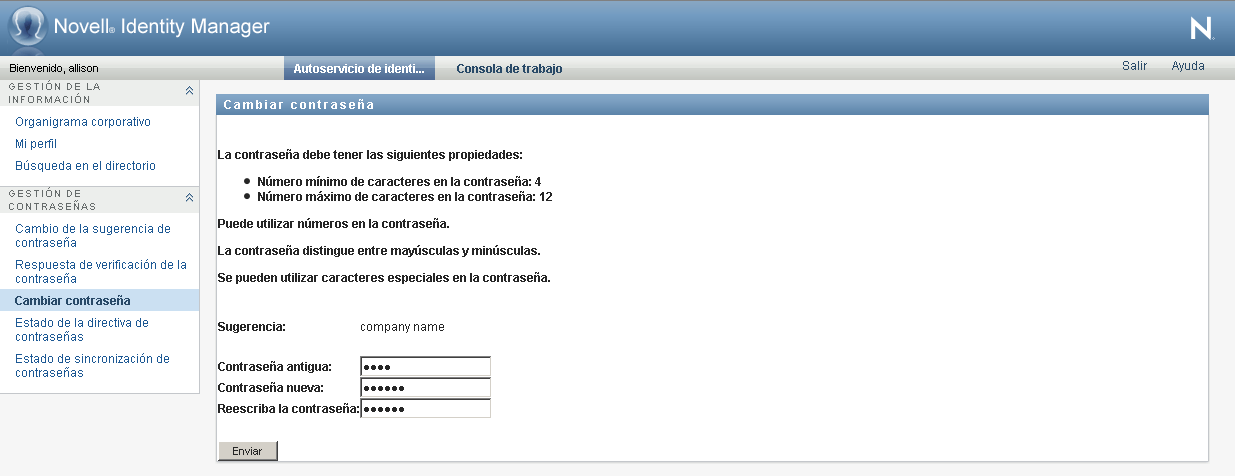 Aparecerá la página Cambiar contraseña. Si el administrador del sistema ha configurado una directiva de contraseña para usted, la página Cambiar contraseña, normalmente, proporciona información sobre cómo especificar una contraseña que satisfaga los requisitos de la directiva. Por ejemplo: