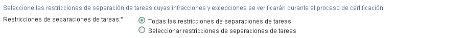 Debe seleccionar como mínimo una restricción de separación de tareas para iniciar un proceso de certificación. Sin embargo, no es necesario seleccionar ninguna para guardar la petición.