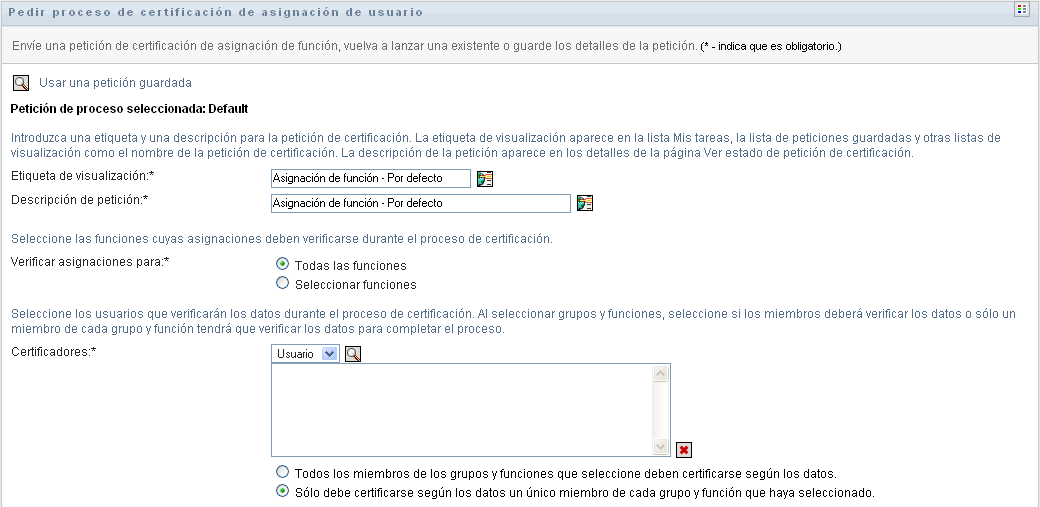 Debe seleccionar como mínimo un usuario, grupo o función como usuario certificador para iniciar un proceso de certificación. Sin embargo, no es necesario seleccionar ninguno para guardar la petición.
