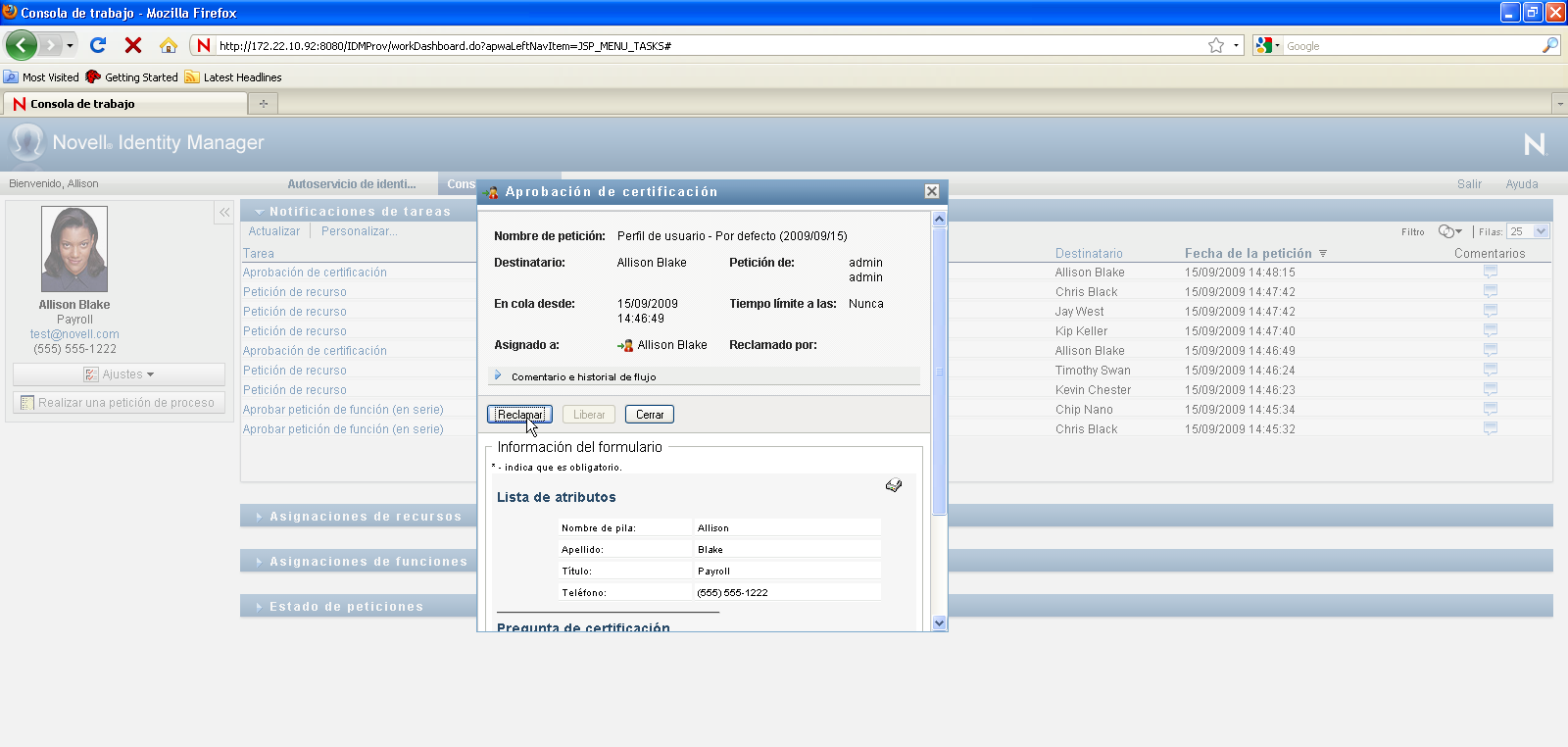 En las peticiones de certificación, la sección de la página se actualiza para incluir el formulario de certificación. La apariencia del formulario varía en función del tipo de certificación. En procesos de certificación de perfil de usuario, el formulario muestra los datos del perfil de usuario que debe revisar: