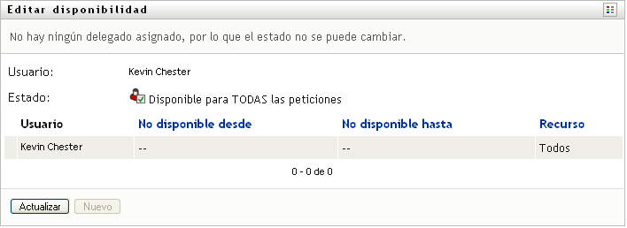 Si no se le han asignado ningún delegado, la Aplicación de usuario muestra un mensaje que indica que no puede cambiar el estado de la página Editar disponibilidad.