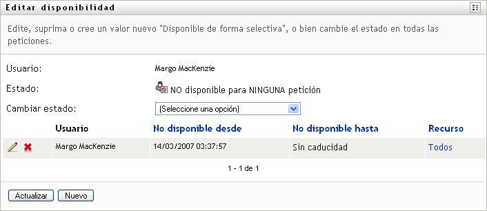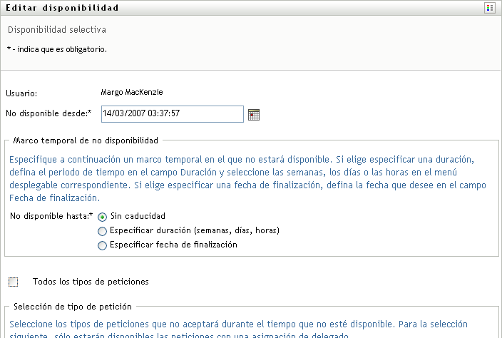La aplicación de usuario muestra un conjunto de controles que permite especificar el período de tiempo durante el que no está disponible y seleccionar las peticiones a las que afectará este valor.