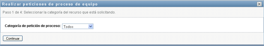 La página Realizar peticiones de proceso de equipo muestra una lista de los procesos que se pueden pedir. La lista sólo incluye los procesos para los que los supervisores de equipo tienen permitido iniciar peticiones.