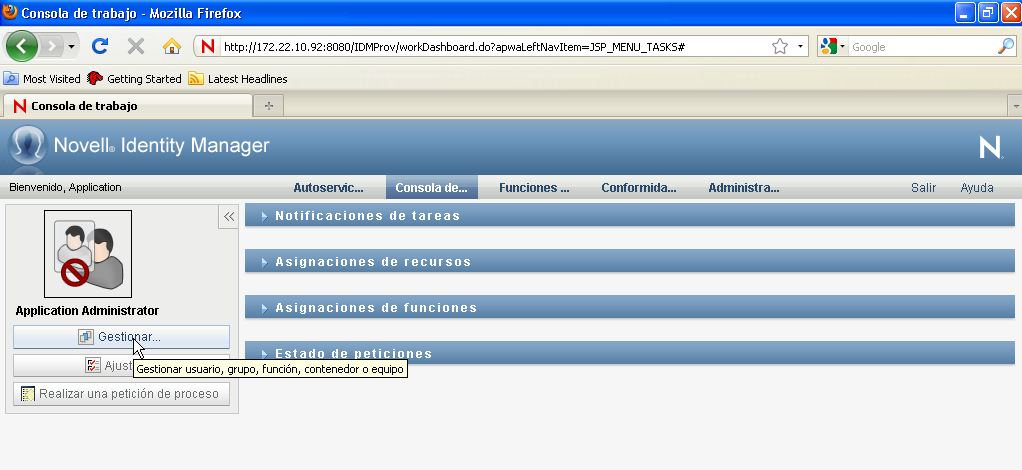 En la Consola de trabajo se muestra la ventana emergente Gestionar: