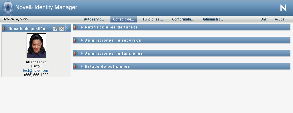 Cuando se selecciona un usuario, un grupo, un contenedor, una función o un equipo, la Consola de trabajo pasa al modo de gestión y actualiza la sección Perfil de usuario de la parte izquierda de la pantalla. La sección Perfil de usuario se actualiza de la siguiente forma: