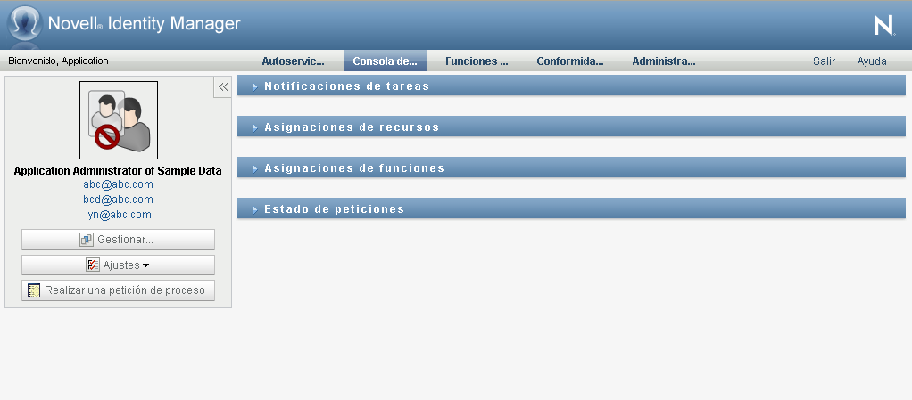 Después de entrar a la sesión, la aplicación de usuario del Gestor de identidades mostrará las páginas que le permitirán realizar su trabajo: