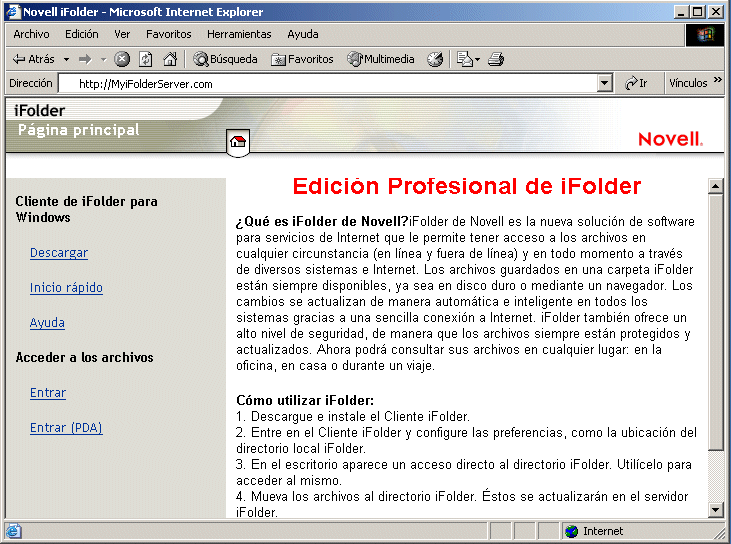 Este sitio contiene el Inicio rápido de iFolder y otra información importante sobre iFolder de Novell. También es el lugar que los usuarios utilizarán para descargar el Cliente iFolder y acceder a sus archivos de iFolder a través de un navegador (mediante el applet Java o acceso HTML para dispositivos PDA como, por ejemplo, iPAQ*).