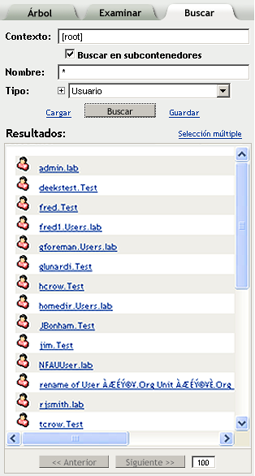 Lista de objetos: Muestra una lista de objetos del directorio, tal y como la definen los criterios del Filtro de objetos. Por defecto, en la lista de objetos se visualizan 100 objetos en una página, pero se puede cambiar este valor en las Preferencias de visualización de objetos. Utilice los botones Anterior y Siguiente para desplazarse entre las páginas de objetos. Si sigue estos pasos puede desplazarse entre los objetos de la lista de objetos: