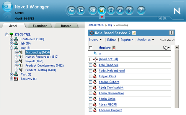 La pestaña Árbol permite examinar un árbol de directorios de forma similar a como se hace con ConsoleOne™. La vista Árbol utiliza tanto el marco de navegación como el marco de contenido para proporcionar su funcionalidad.