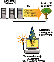 El Asistente de migración de NetWare® 6 de Novell® copia y consolida el Bindery y el sistema de archivos de NetWare 3 de uno o varios servidores NetWare 3 existentes en un árbol NDS® de destino.