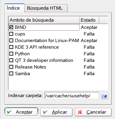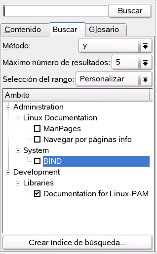 Si no se ha generado previamente ningún índice de búsqueda, el sistema solicita automáticamente que lo cree al hacer clic en la pestaña Buscar o al introducir una cadena de búsqueda y hacer clic en Buscar. En el recuadro de diálogo que permite generar el índice de búsqueda (se muestra en la Figura 9 siguiente), utilice las casillas de verificación para determinar las fuentes de información que deben indexarse. El índice se genera cuando se sale del diálogo haciendo clic en Aceptar.
