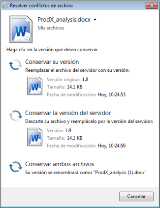 Conservar la versión del servidor: descarta su archivo y lo reemplaza por la versión disponible en el servidor de Filr.
