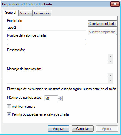 Por defecto, el propietario es el usuario que crea el salón de charla.