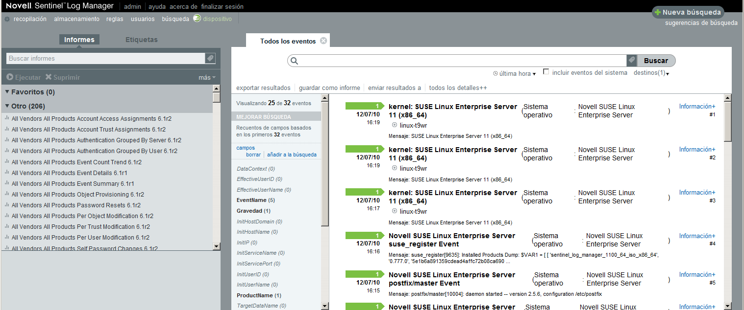 Se muestra la interfaz basada en la Web de Novell Sentinel Log Manager.
