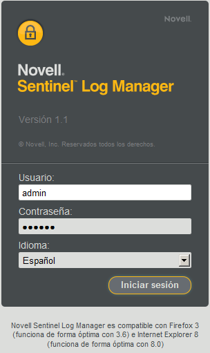 El usuario administrador creado durante la instalación puede entrar en la interfaz Web para configurar y utilizar Sentinel Log Manager: