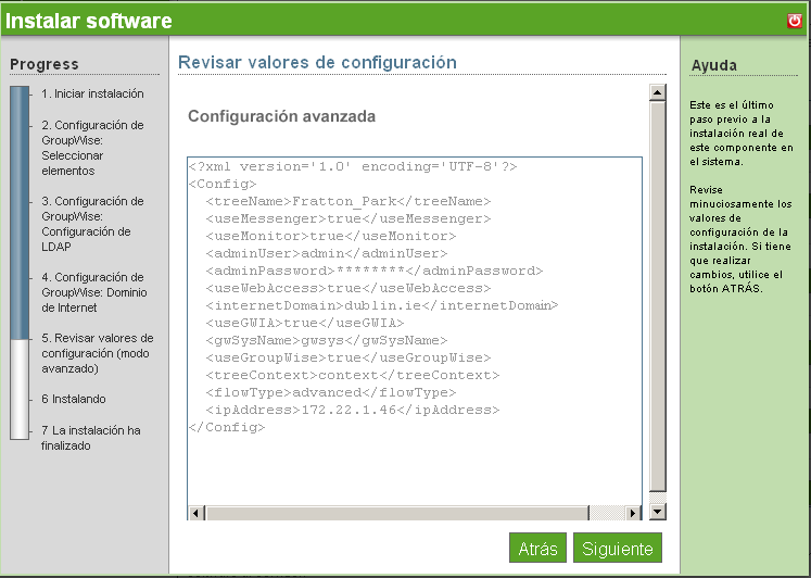Revise los ajustes de la instalación. Para realizar cambios, haga clic en (Atrás). Para continuar con la instalación, haga clic en (Siguiente).
