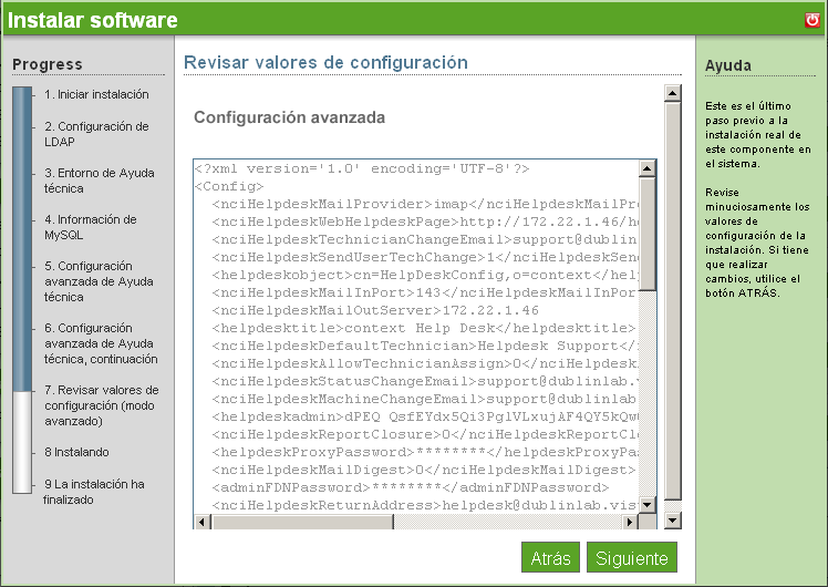 Revise sus parámetros. Para realizar cambios, haga clic en (Atrás). Para continuar con la instalación, haga clic en (Siguiente).