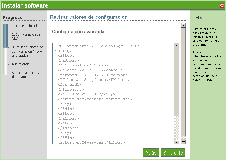 Revise los parámetros. Para realizar cambios, haga clic en (Atrás). Para continuar con la instalación, haga clic en (Siguiente).