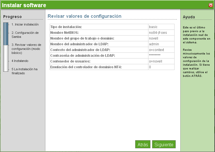 Revise los parámetros. Para realizar cambios, haga clic en (Atrás). Para continuar con la instalación, haga clic en (Siguiente).