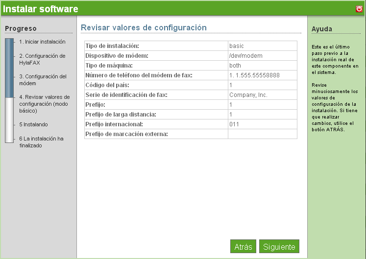 Revise los parámetros. Para realizar cambios, haga clic en (Atrás). Para continuar con la instalación, haga clic en (Siguiente).