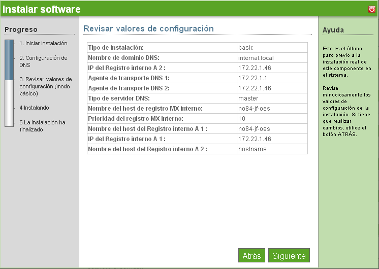 Revise los parámetros. Para realizar cambios, haga clic en (Atrás). Para continuar con la instalación, haga clic en (Siguiente).
