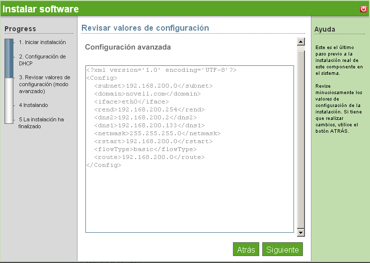 Revise los parámetros. Para realizar cambios, haga clic en (Atrás). Para continuar con la instalación, haga clic en (Siguiente).