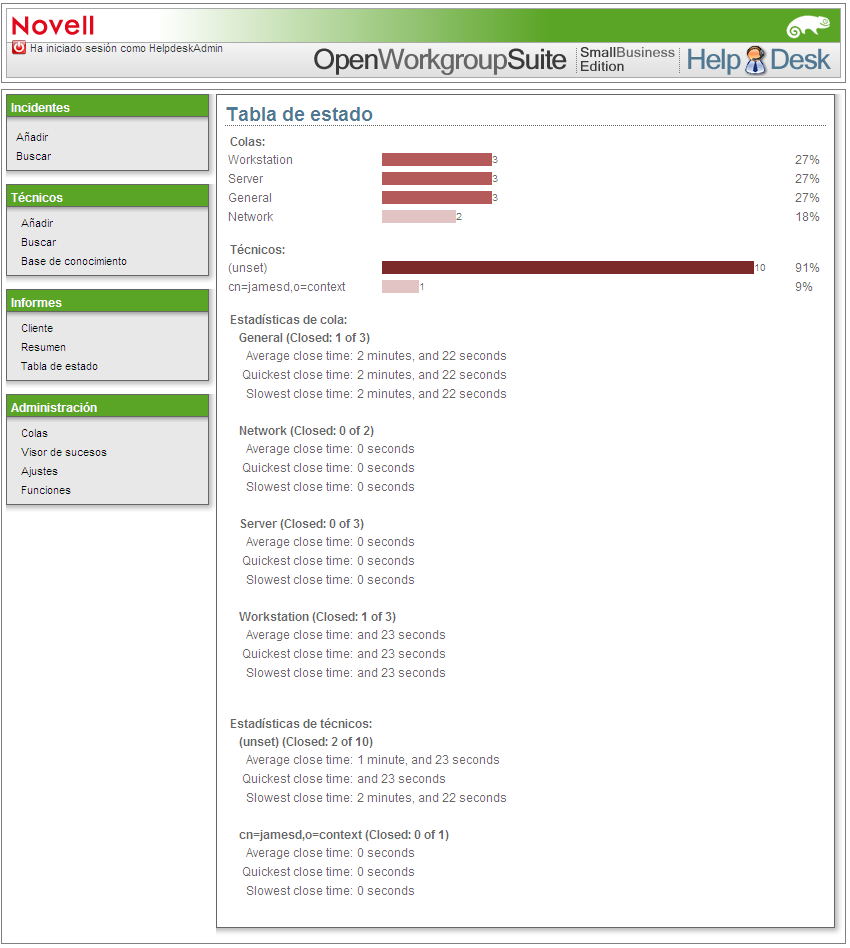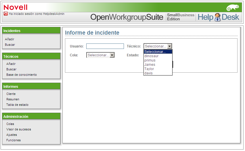 En la sección , puede hacer búsquedas por usuario, técnico asignado, nivel de cola y estado del informe de Helpdesk.