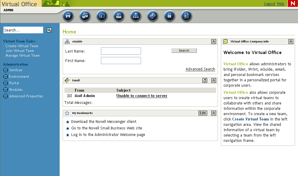 Si se ha instalado un servidor de colaboración de Novell Small Business (Suite Pymes) con el patrón Virtual Office, la página Virtual Office se convierte en el portal del usuario final por defecto. Los enlaces facilitados permiten personalizarlo para su organización. Si desea obtener más información acerca de la configuración de Virtual Office, consulte los enlaces que se proporcionan en esta página y la Guía de configuración de Virtual Office de Novell.