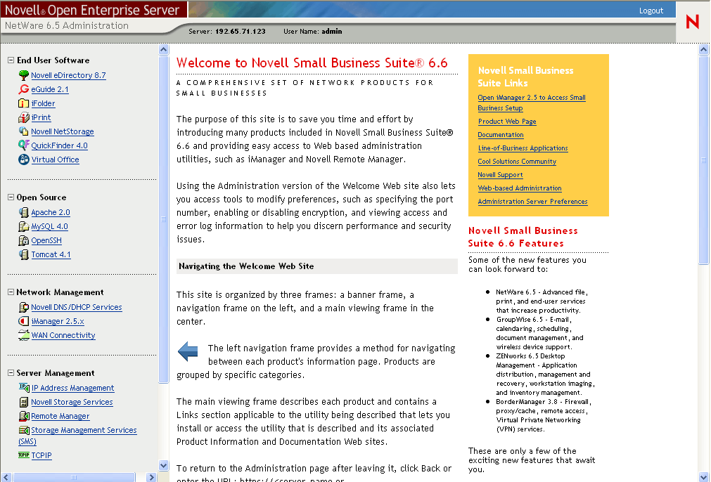 Para los usuarios finales, el sitio Web de bienvenida consiste básicamente en una fuente de información que les permite familiarizarse con las funciones disponibles. Acceden al sitio Web mediante el protocolo sin seguridad (http) y el puerto 80 estándar. Esta versión del sitio Web ofrece información acerca de cada uno de los productos, enlaces a la documentación e información sobre los productos que todavía no se han instalado.