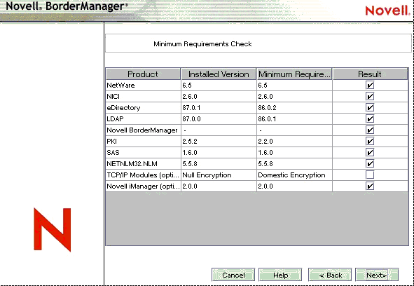 Si no se cumple alguno de los requisitos mínimos, excepto los módulos TCPIP o iManager 2.0, la instalación se abortará. Realice las acciones necesarias para cumplir los requisitos de acuerdo con la información de la figura anterior y reinicie la instalación. Si no se cumplen los requisitos básicos para los módulos TCPIP, aparecerá un mensaje de advertencia. Puede omitirlo y realizar la instalación, aunque deberán copiarse los módulos TCPIP correspondientes más adelante (consulte Requisitos previos para la instalación de Novell BorderManager 3.8) si desea utilizar los servicios VPN.