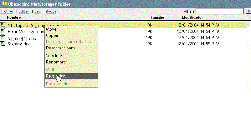 A modo de ejemplo, considere una situación en la que el usuario desea recuperar una versión anterior del archivo "11 Steps to Signing Success.doc". Para iniciar la búsqueda, el usuario hace clic con el botón derecho del ratón en un archivo de la interfaz de NetStorage, y a continuación, hace clic en Respaldar, como se muestra a continuación. (Consulte la Figura 4.) El conjunto de versiones del archivo del directorio "guest" no contenía la versión del archivo que el usuario necesitaba.