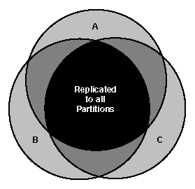 The following figure shows that each of the three servers (A, B, and C) record a high percentage (for example, 99%) of all of the audit records, however, each of the servers might have audit records that were not successfully replicated to the other two servers.