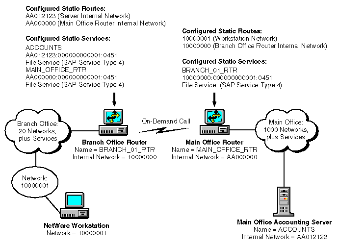When used with on-demand calls, static routes and services are useful for connections that use expensive telecommunications carriers and for slow links over which it is undesirable to exchange routing and service information. Consider an internetwork that connects tens to hundreds of branch offices to a single main office. Typically, each branch office requires periodic access to information at the main office. However, it is most likely that the main office periodically polls the branch offices to get up-to-date information, such as the day's sales figures. Because a permanent call to each branch office is not necessary, connections to the main office need only be low-speed, dial-up lines. For this reason, the first several minutes of the call should not be taken up by a flood of routing and service information into a branch office. Nor should there be a relatively smaller flood of (mostly irrelevant) routing and service information from a branch office into the main office.