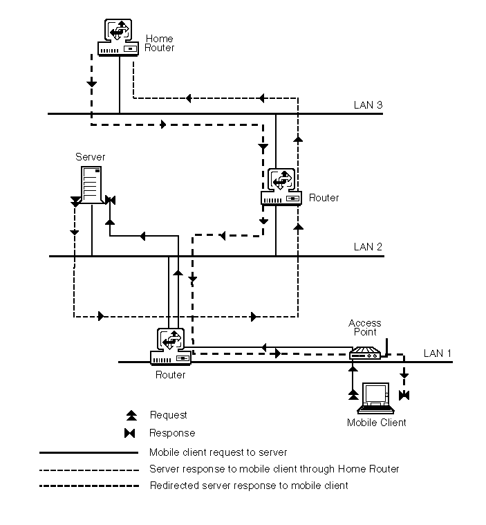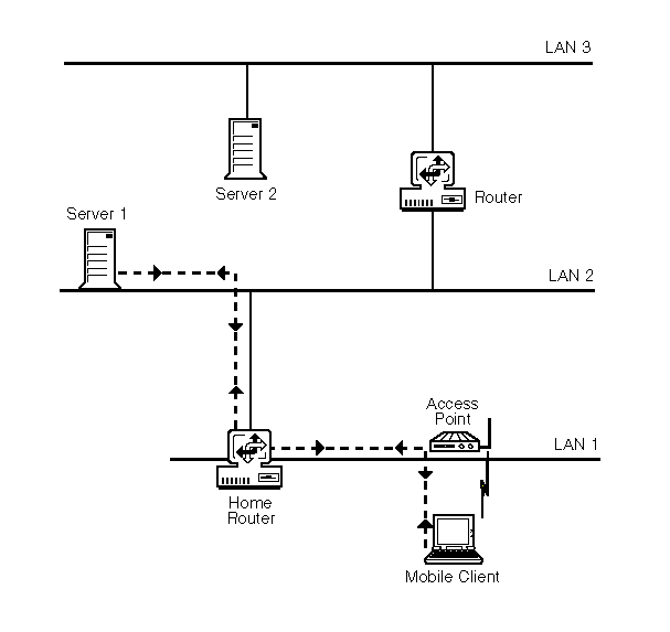 A Home Router forwards every packet destined for the mobile clients it serves. If the Home Router is located far from both the file server and the mobile client, and if the mobile client is close to the file server, a packet destined for the mobile client travels more hops than necessary before arriving at the destination, as shown in Figure 7.