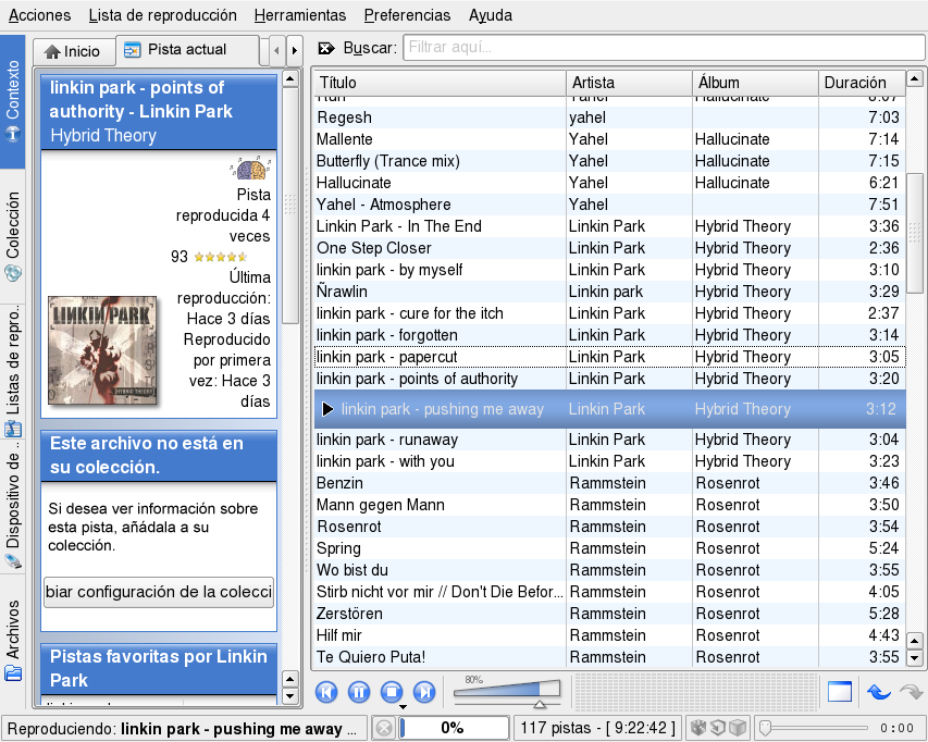 La ventana principal de la aplicación incluye una barra lateral a la izquierda con varias vistas: la colección de música, un explorador de contexto, las listas de reproducción, un explorador de archivos, etc. La parte derecha de la ventana muestra la lista de reproducción actual. Para reproducir música, basta con arrastrar elementos de cualquiera de los exploradores de la barra lateral y soltarlos en el área de lista de reproducción. Haga doble clic en un elemento de la lista de reproducción para reproducirlo.
