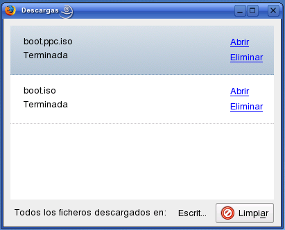 Si descarga un archivo con Firefox, el administrador de descargas se inicia y guarda el archivo en la carpeta que esté configurada en las preferencias. Por defecto, el escritorio es la carpeta de destino donde se almacenan los archivos descargados. Firefox muestra las descargas finalizadas en un cuadro de diálogo.