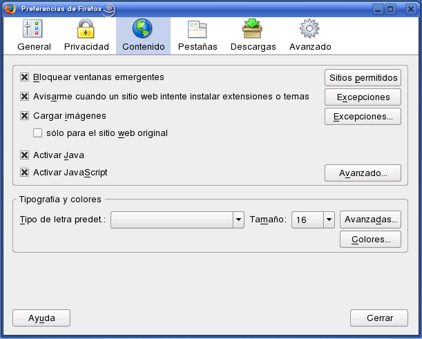 Para cambiar la carpeta de descarga por defecto o activar o modificar la función de bloqueo de ventanas emergentes, haga clic en .