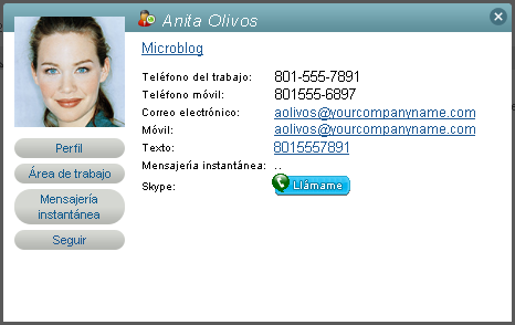 El icono de se muestra junto al nombre de un usuario siempre que dicho usuario haya publicado o comentado una entrada de Vibe. Cuando se hace clic en el icono de presencia, se muestra la vista rápida del perfil.